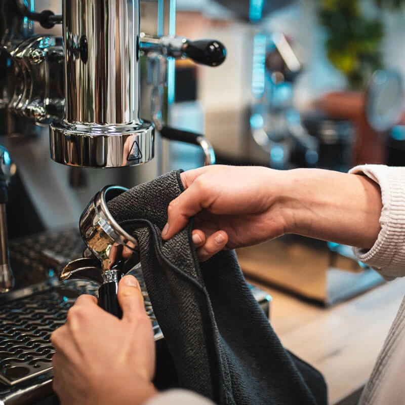 Das COYOOCO Barista Handtuch dient dem sauberen Arbeiten an der Espressomaschine. Das Startup aus Mannheim hat erkannt, dass es für viele Heimbaristas unnötig kompliziert ist, an der Siebträgermaschine mit mehreren Lappen zu hantieren. Die Innovation in der ansonsten zugegeben langweiligen Lappenbranche schafft Abhilfe und ist wirklich clever. Mit dem Barista Handtuch können drei Lappen und Tücher durch ein einziges ersetzt werden. Das Tuch dient in erster Linie dazu, den Siebträger bzw. das Sieb nach jedem Bezug nach dem Abklopfen vom zurückbleibenden Kaffeesatz zu befreien. Ein sauberes und trockenes Sieb ermöglicht, dass der nächste Espresso perfekt wird. Außerdem kann es zum Abwischen und Ausblasen der Dampflanze, sowie zum Abwischen der Espressomaschine selbst verwendet werden.