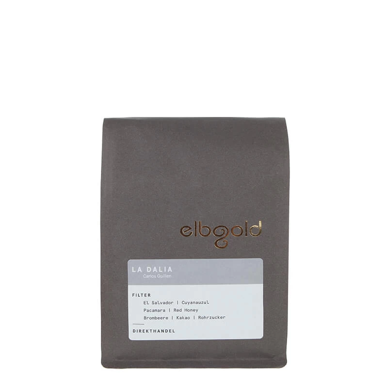 Der Blend El Salvador La Dalia von Elbgold ist ein sortenreiner Arabica Kaffee der Varietät Pacamara. Die Bohnen stammen aus der Region Cuyanuzul in El Salvador. Dort wurde er vor Ort nach dem Red Honey Processing aufbereitet. Geschmacklich zeichnet den Blend eine Mischung der Aromen von Brombeeren, Kakao und Rohrzucker aus.