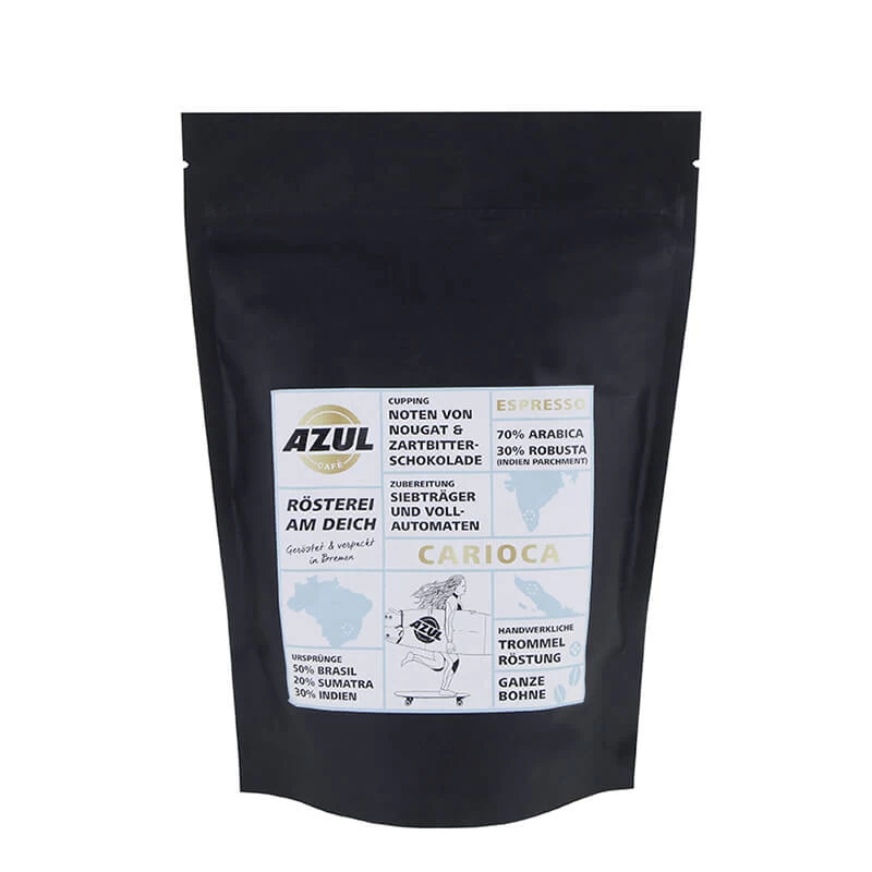 Der Espresso Carioca der Azul Rösterei ist eine Mischung von Bohnen aus Brasilien, Sumatra und Indien. Bei den Indian Parchment Robustas handelt es sich um eine gewaschen aufbereitete Robusta Bohne, welche in Harmonie mit den anderen Bohnensorten einen Espresso voller Lebensfreude kreiert. Die dunkle Röstung verleiht den Bohnen einen intensiven, vollmundigen Geschmack mit schokoladigen Nuss-Nougataromen und einer kräftigen Crema.