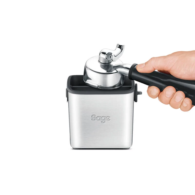 Die Abschlagbox von Sage gehört zur Kern Ausstattung jeder Heimbarista Küche. Der robust konstruierte Abklopfbehälter hat dank des Anti-Rutsch-Bodens einen sicheren Stand. Die Klopfstange ist gummiert und kann, zur einfacheren Reinigung des Behälters, herausgenommen werden. Die Größe des Abklopfbehälters ist für den heimischen Gebrauch absolut angemessen.