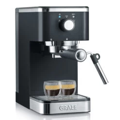 Die Graef Salita ist eine kompakte Siebträgermaschine. Das hochwertige Kunststoffgehäuse wird mit einem Edelstahlband optisch aufgewertet und unterstreicht das moderne Design der Salita.